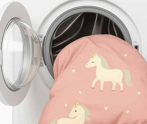 Geen overtrek losmaken. Je stopt gewoon het hele dekbed in de machine en klaar!