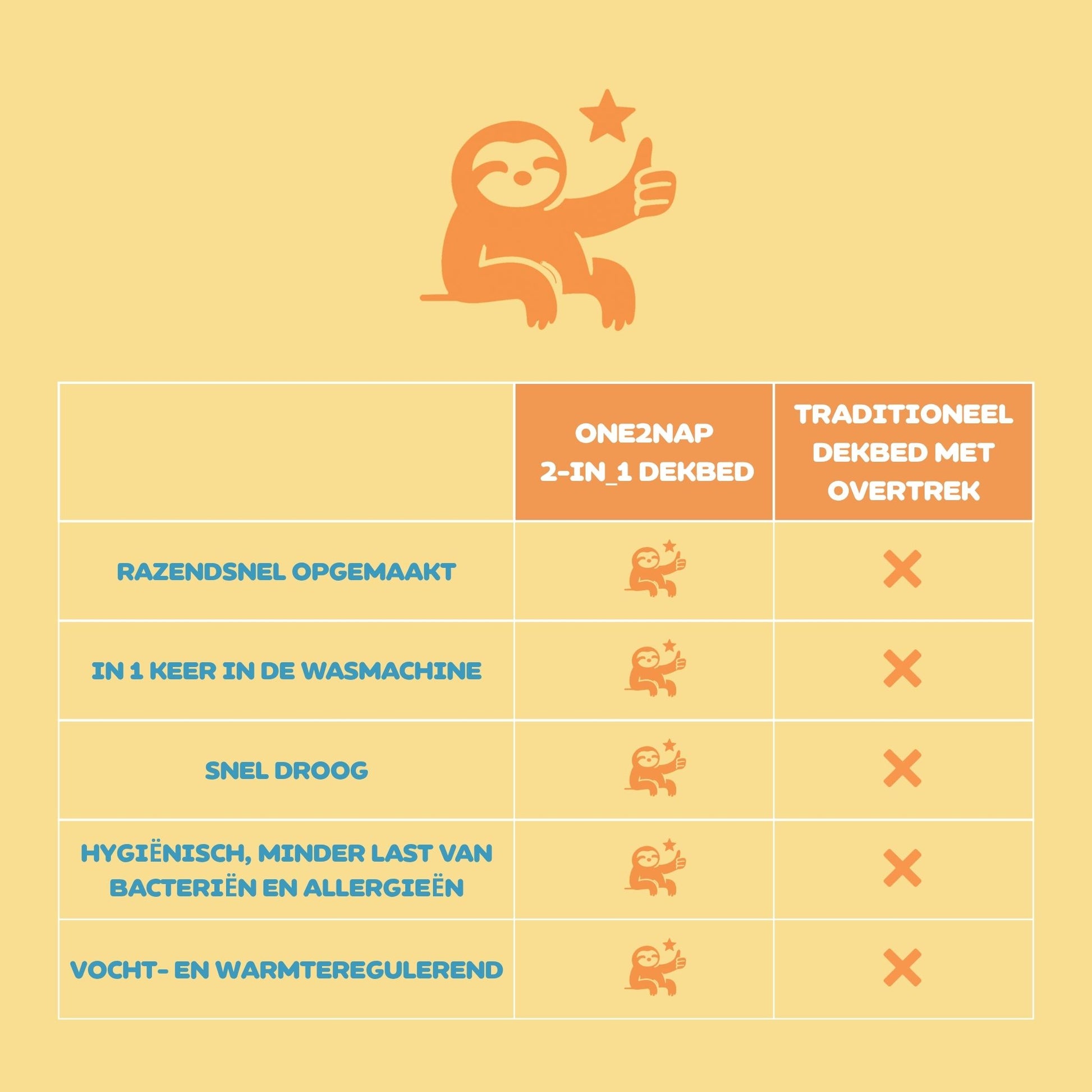 Antwoord: Ja. Alle One2Nap-dekbedden zijn OEKO-TEX® Standard 100 gecertificeerd. Dat betekent dat elk onderdeel — van de stof tot de vulling en het stikgaren — getest is op schadelijke stoffen en veilig is voor dagelijks contact met de huid.